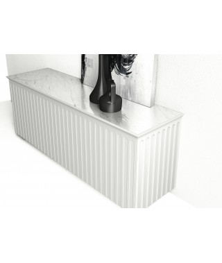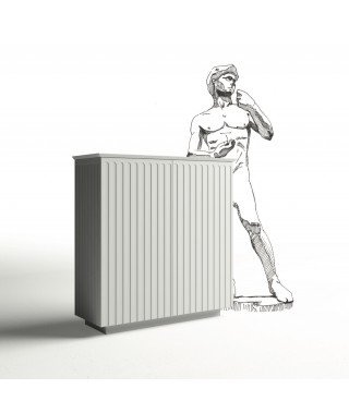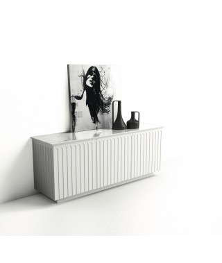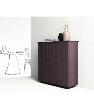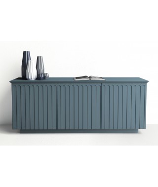 Credenza e madia in agglomerato di legno con ante battenti e ripiani interni regolabili in altezza, lavorazione geometrica sulle superfici verticali esterne. Disponibile nella finitura goffrata nei colori a campionario ed in finitura super opaca nei colori in scheda Super Matt.