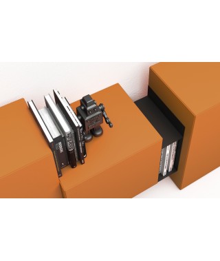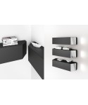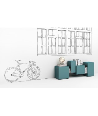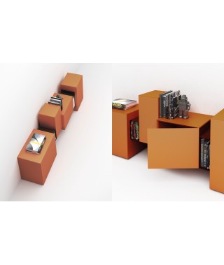 Credenza composta da contenitori in agglomerato di legno disponibili nei colori a campionario in finitura goffrato, inserti in metallo disponibili nei colori a campionario, finitura goffrata
