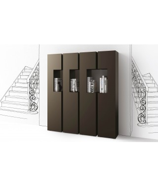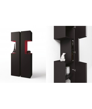 Contenitore autoportante in agglomerato di legno con anta sagomata, lavorazione a 45° sui quattro lati, cinque ripiani interni di cui due spostabili, piedini altezza due cm regolabili. Finitura goffrata nei colori a campionario. Il vano a giorno puo’ essere in finitura goffrata nei colori a campionario, in finitura foglia argento e foglia oro.