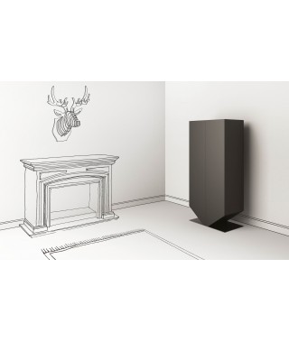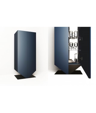 Madia in agglomerato di legno con due ante sagomate, lavorazione a 45° sui quattro lati, tre ripiani spostabili in cristallo extra – chiaro, schienale interno a specchio.  Contenitore in finitura goffrata nei colori a campionario, base in metallo colore antracite in finitura goffrata.