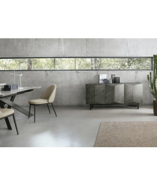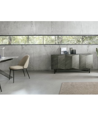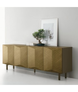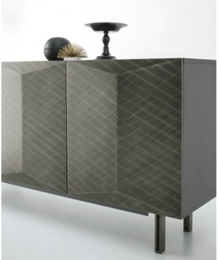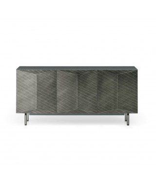 I frontali tridimensionali aggiungono profondità e stile alla credenza moderna. Le finiture in laccato spazzolato esaltano le geometrie originali.