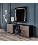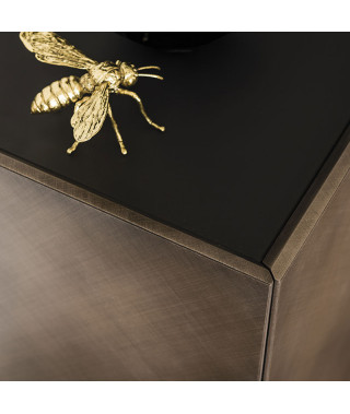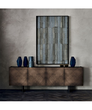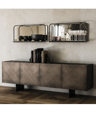 Madia contenitore in legno Brushed Bronze o Brushed Grey. Top in cristallo extrachiaro verniciato moka acidato. Piedi in acciaio verniciato goffrato nero (GFM73). Ripiani interni in legno color graphite.