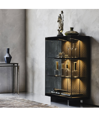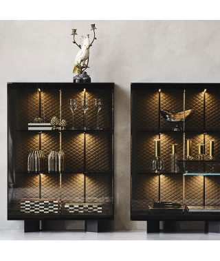 Madia con struttura e piedi in acciaio verniciato goffrato nero (GFM73), ante e fianchi in cristallo fumè con fasce in cristallo verniciato nero.