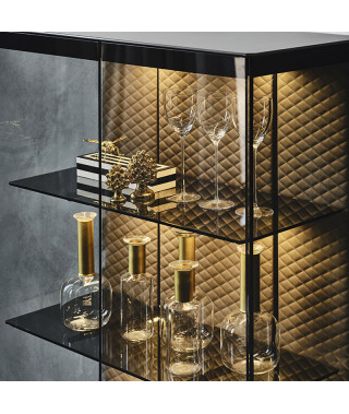 Top e fondo in cristallo verniciato nero acidato, schienale interno in ecopelle o pelle trapuntata come da campionario.