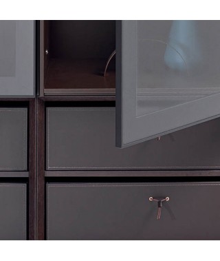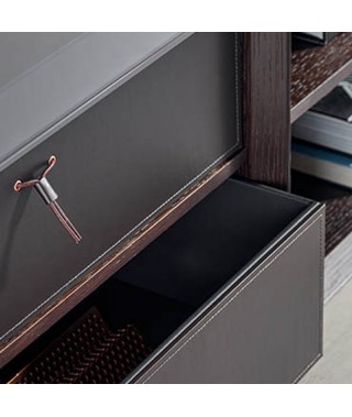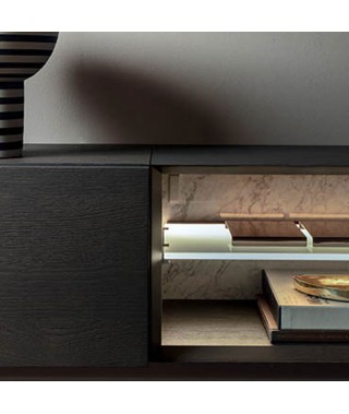 La scocca a folding e l’assenza di maniglie delineano un design continuo e discreto, che ha come contrappunto preziosi accenti, come le fasce distanziali, le mensole in vetro retroilluminate, i nuovi frontali in cuoio e le schiene nei marmi materici.