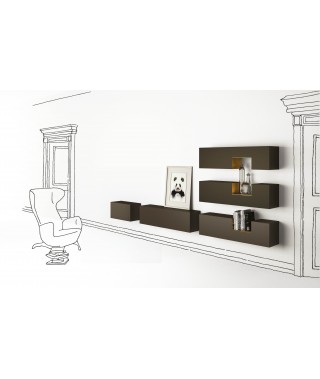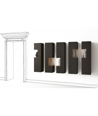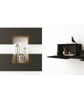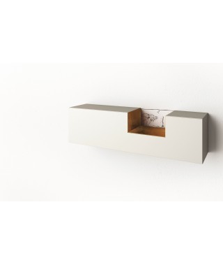 Contenitore pensile in agglomerato di legno, orizzontale e verticale con anta sagomata (vasistas / ribalta / battente).  Finitura goffrata nei colori a campionario. Il vano puo’ essere in finitura goffrata nei colori a campionario, in finitura foglia argento e foglia oro.