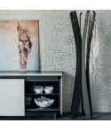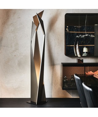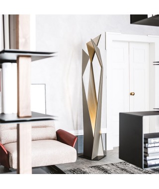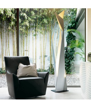 Lampada da terra con struttura in acciaio verniciato bianco (OP71) opaco, goffrato titanio (GFM11) o bronzo (GFM18) e base nera. Lampadina non inclusa nella versione a 110V.