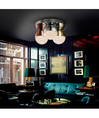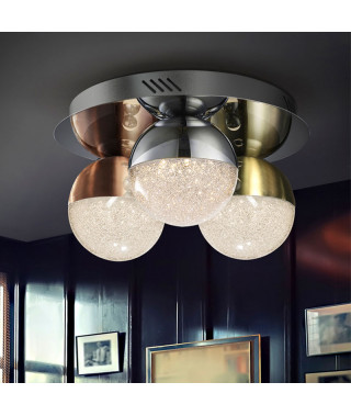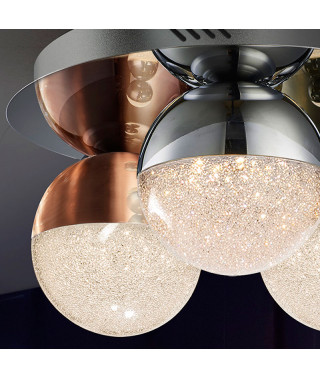 Plafoniera a 3 luci LED, in metallo cromato. Paralumi sferici da 12 cm. in policarbonato testurizzato all’interno e metallo rifinito in rame satinato, ottone satinato e cromo. 14,4W LED, 3.000K, 1.000 lm. DIMMERABILE.