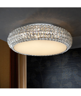 Plafoniera grande in metallo cromato. Paralume a cristalli trasparenti quadrati. Fornito di diffusore inferiore di vetro opalescente.