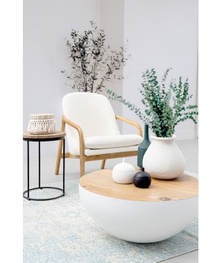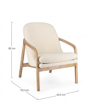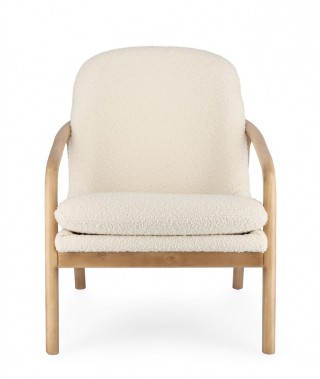 STRUTTURA IN RUBBERWOOD. SEDUTA IN LEGNO DI PINO E COMPENSATO. RIVESTIMENTO IN POLIESTERE EFFETTO BOUCLE'. DENSITA' IMBOTTITURA IN SCHIUMA POLIURETANICA 24 KG/M3. CUSCINO SEDUTA SFODERABILE.