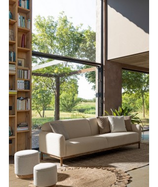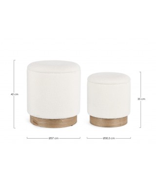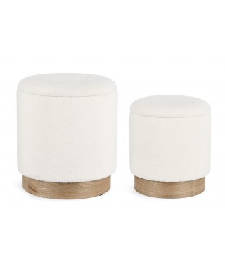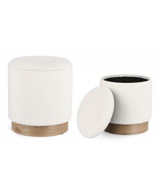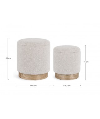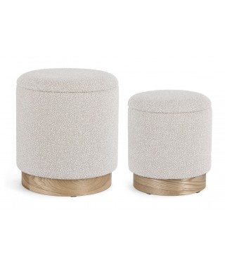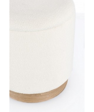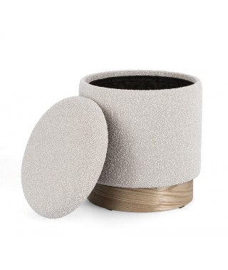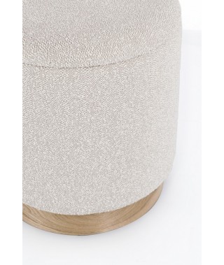 STRUTTURA IN MDF E COMPENSATO. FONDO CON ANELLO DECORATIVO IN LEGNO DI FRASSINO. RIVESTIMENTO IN POLIESTERE EFFETTO BOUCLE'.