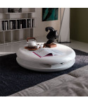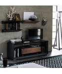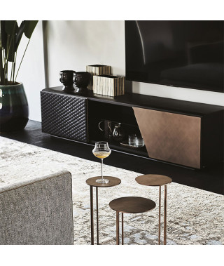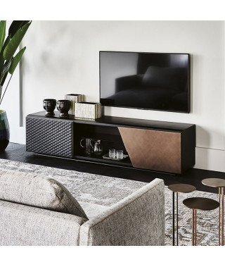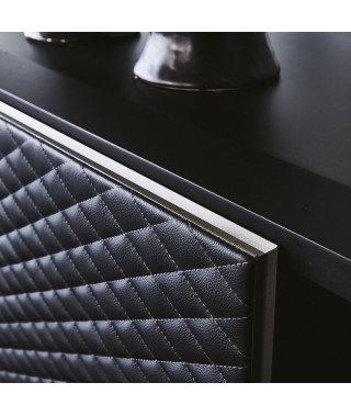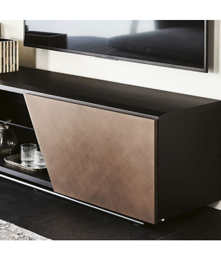Mobile porta tv in legno goffrato titanio (GF11) o nero (GF73) e base in acciaio goffrato titanio (GFM11) o nero (GFM73). Anta sinistra rivestita in ecopelle o pelle trapuntata nei colori come da campionario con profili in alluminio verniciato titanio (GFM11) goffrato. Anta destra in noce Canaletto (NC), rovere bruciato (RB) o Brushed Bronze con particolari in cromo nero (06). Ripiani interni in cristallo fumè.