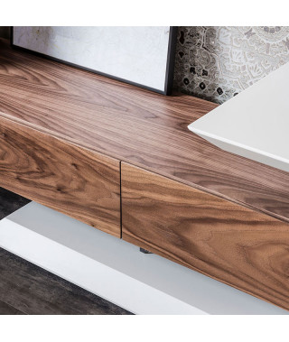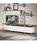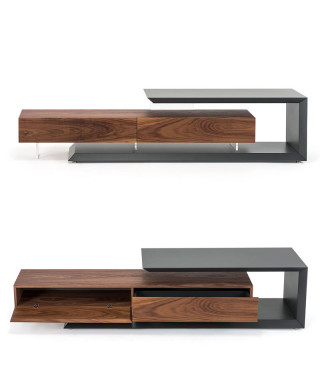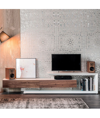 Mobile porta tv reversibile e adattabile in lunghezza con struttura verniciata goffrato graphite (GF69) o bianco (GF71). Cassettiera e ante in noce Canaletto (NC), goffrato graphite (GF69) o bianco (GF71).