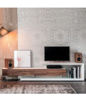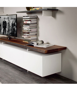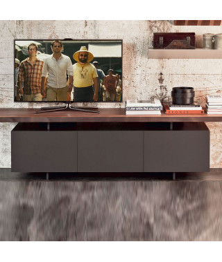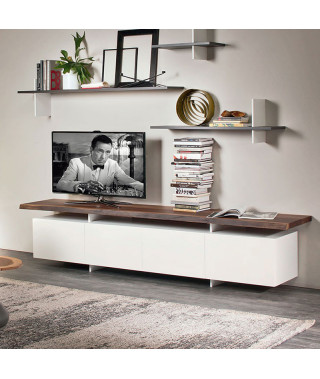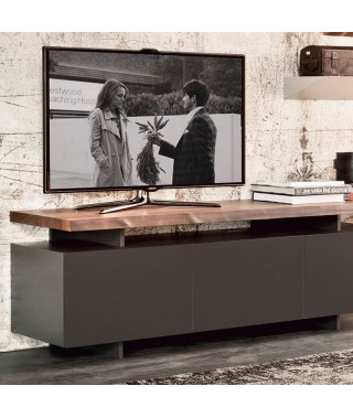 Mobile porta tv a 3 o 4 ante in legno verniciato bianco (OP7) o graphite (OP69) opaco. Piano in tinta o in noce Canaletto (NC), rovere bruciato (RB) o rovere naturale (RN) con bordo irregolare in massello.