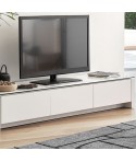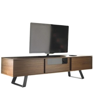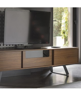 Mobile basso porta TV modello SECRET con 2 cassetti laterali e 1 vano centrale chiuso con ribalta in legno impiallacciato, dotato di frontalino anteriore in vetro temprato, ripiano in nobilitato e foro passacavi posteriore.