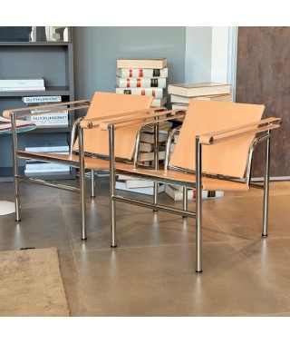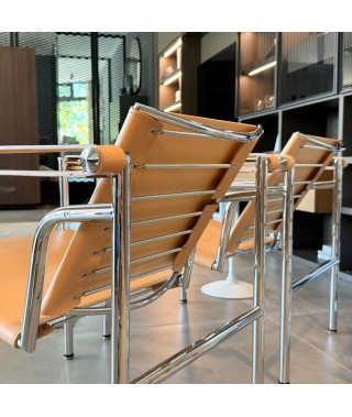 Struttura in tubo d’acciaio cromato verniciato, rivestimento seduta in cuoio verde.