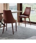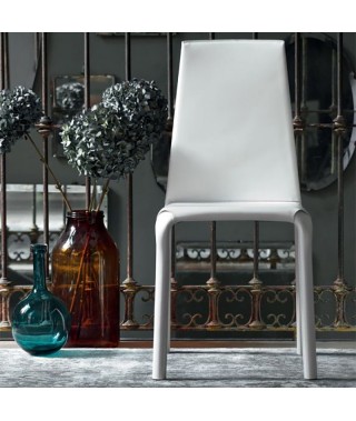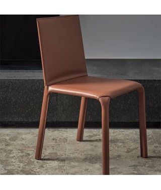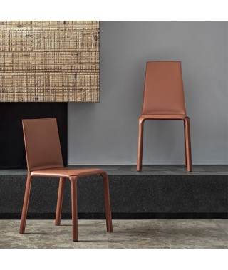 Sedia con struttura in Acciaio, completamente rivestita in Cuoio. Disponibile nella versione con spalliera alta o bassa.