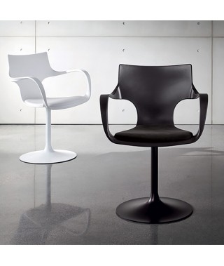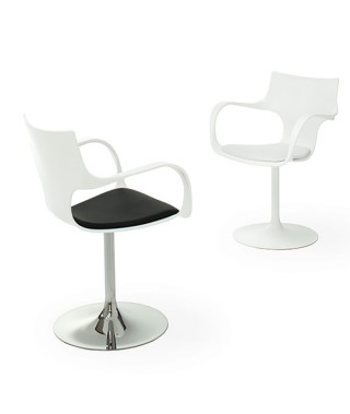 Sedia girevole con braccioli. Struttura in metallo cromato o laccato bianco o nero.