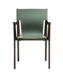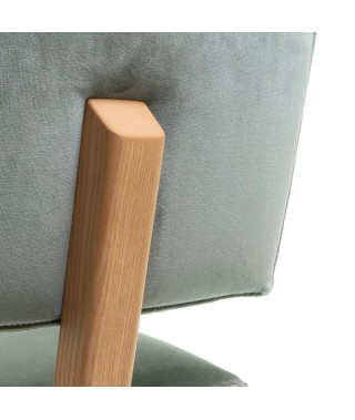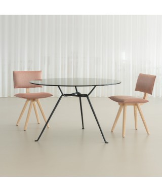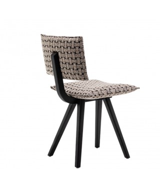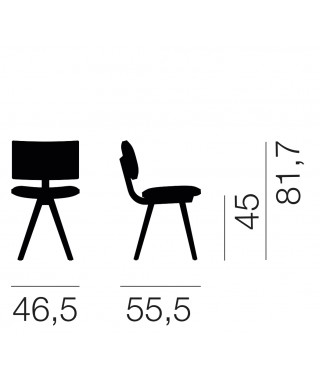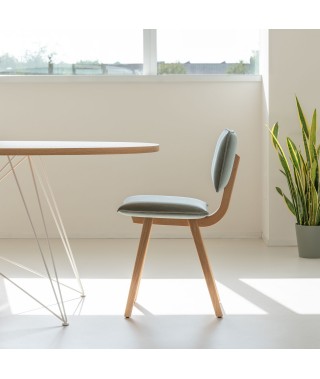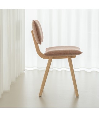 Materiali: trave portante curvata e gambe in massello di frassino o finitura rovere; sedile e schienale imbottiti e rivestiti in tessuto (Fidivi Torino, Kvadrat Reflect, Torri Lana Parallel, Rubelli Spritz, Rubelli Fabthirty) sfoderabili.