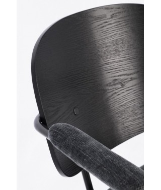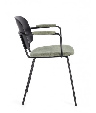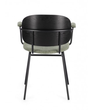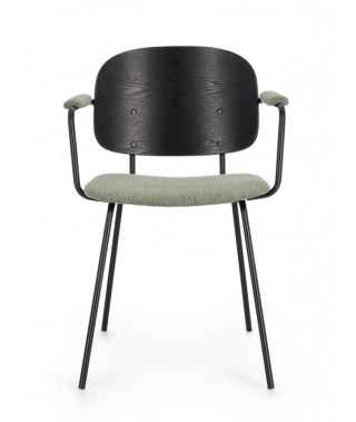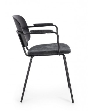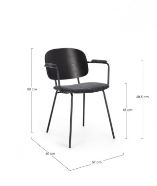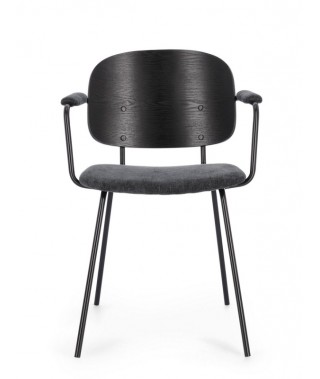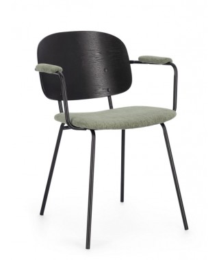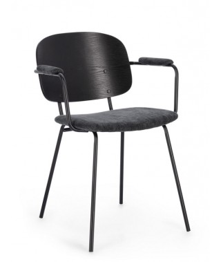 STRUTTURA IN ACCIAIO VERNICIATA A POLVERE EPOSSIDICA. SCHIENALE IN COMPENSATO IMPIALLACCIATO LEGNO DI PIOPPO. SEDUTA E BRACCIOLI IN COMPENSATO CON RIVESTIMENTO IN 100% POLIESTERE.