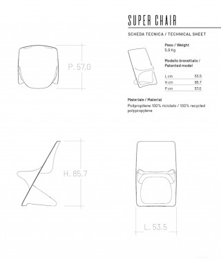 Super Chair è in polipropilene 100% riciclato e riciclabile, prodotto mediante la tecnologia RE-LIFE® che consente di ottenere materia prima dal riciclo degli scarti industriali senza l'utilizzo di risorse fossili. Grazie a questa tecnologia è possibile creare prodotti ecosostenibili che non solo non utilizzano risorse fossili ma permettono anche di pulire il sistema dagli scarti industriali rigenerandoli in materie prime nuove.