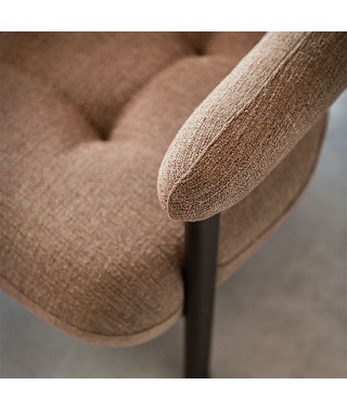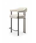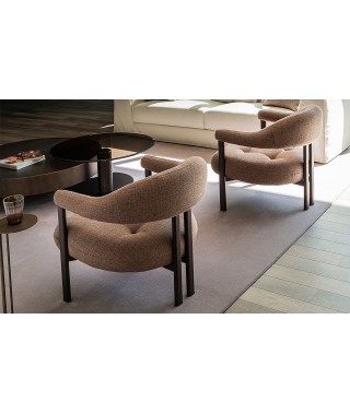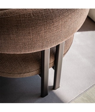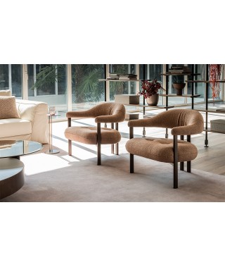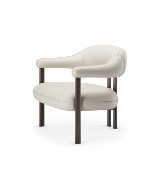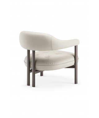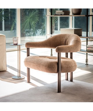 Greta Lounge, sedia moderna con braccioli imbottiti, si distingue per la divisione tra seduta e cuscino avvolgente, che unisce schienale e braccioli. Lo schienale sospeso, morbido e confortevole, è composto da un cilindro sagomato che avvolge la schiena, terminando in braccioli imbottiti. Materiali morbidi o metallici, volumi pieni o vuoti, forme accoglienti o incisive si sovrappongono tra seduta e base, creando un gioco di contrasti intrigante. La gamba centrale, in realtà due gambe ravvicinate, riprende il concetto di pieni e vuoti tra schienale e seduta, contribuendo a un design coerente, leggero ed equilibrato.