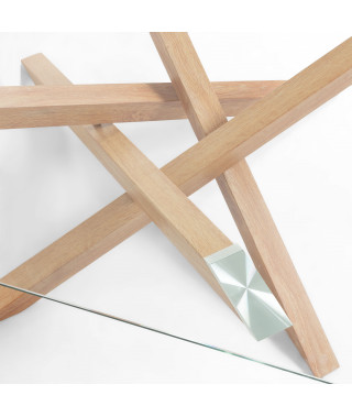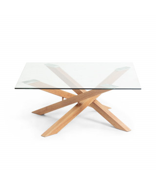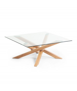 Tavolino da caffè quadrato con piano in vetro trasparente temperato spesso 10mm. Gambe in metallo con finitura in legno. Altezza di 38 cm.