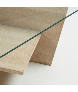 Tavolino da caffè rettangolare con piano in vetro. Gambe in legno massello di rovere sbiancato. Altezza 36 cm.