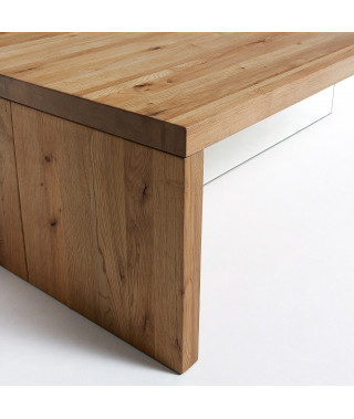 Tavolino con base e lati in rovere massello. Gamba centrale in vetro temperato.