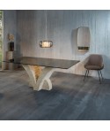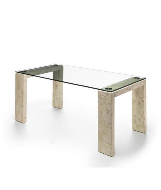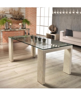 Tavolo Millerighe, top in vetro temperato e gambe in pietra fossile con fresate orizzontali, particolarità del design che da il nome al tavolo. Trasparenza e bellezza. Elegance on another level.