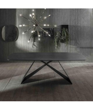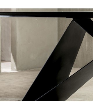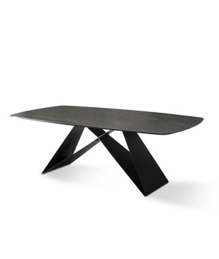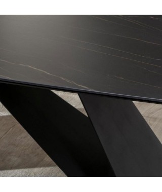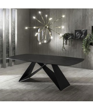 Thanos, tavolo in ceramica su vetro temperato, interessantissima superfice effetto portoro ed altresì singola struttura in metallo verniciato che lasciano libera espressione all'immaginazione, grande e comodo per cena con amici e parenti.