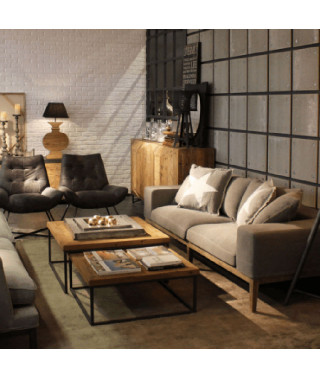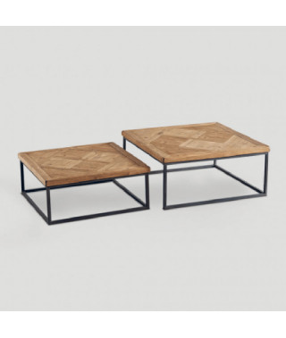 Set di 2 tavolini quadrati sovrapponibili, struttura in metallo finitura Ferro Brunito, top a quadrotta in legno vecchio riciclato finitura Naturale.