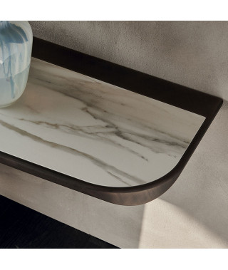 Piano in ceramica Marmi nei colori Alabastro (KM02), Supreme (KM03), Ardesia (KM04), Golden Calacatta opaco (KM05), Golden Calacatta lucido (KM06), Portoro opaco (KM07), Portoro lucido (KM08), Sahara Noir lucido (KM09), Emperador (KM10), Makalu (KM11), Breccia (KM12), Arenal (KM13) o Zefiro (KZ20) con profilo inferiore arrotondato e verniciato Brushed Bronze o Brushed Grey. Fissaggio a parete necessario.