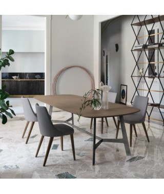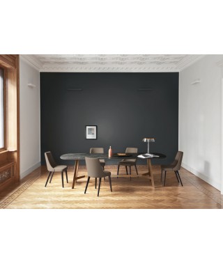 Questa struttura può supportare diversi piani, sia ovali che rettangolari disponibili in materico, impiallacciato o in varie finiture ceramica con bordi smussati e diverse caratteristiche nella lavorazione, a seconda della variante.