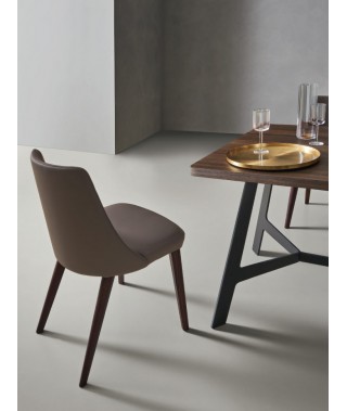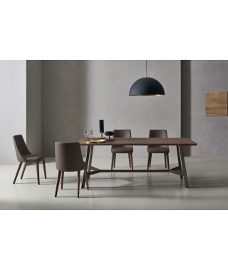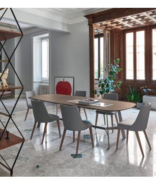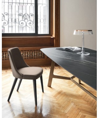 Il tavolo Vertigo ha un basamento in metallo verniciato che si allarga verso il basso, fornendo un ampio appoggio.