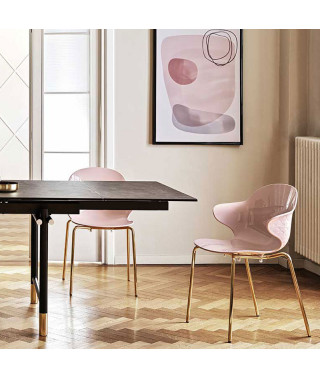 La scocca in policarbonato è realizzata in diverse tonalità trasparenti o coprenti ed è montata su un basamento a 4 gambe in metallo, impilabile. Scegli la tua preferita.