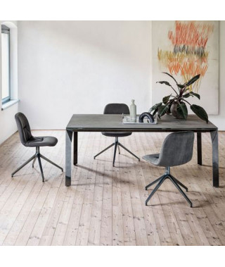 Sedia con struttura girevole in pressofusione di Alluminio laccato, senza ruote. Scocca imbottita e rivestita in Pelle Ecologica, Velluto tecnico, tessuto Mambo, tessuto Lulù, Waterproof Nabuk, Waterproof Nabuk stampato, Pure Virgin Wool, Velluto, tessuto Decò, tessuto Kvadrat field, tessuto Kvadrat coda e Pelle Premium.
