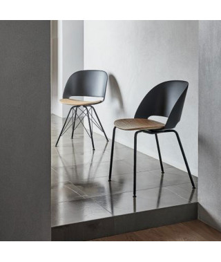 Sedia con struttura in Acciaio laccato e gambe a sezione tonda. Schienale in polipropilene e seduta in legno o imbottita e rivestita in Pelle Ecologica, Velluto tecnico, tessuto Mambo, tessuto Lulù, Waterproof Nabuk, Waterproof Nabuk stampato, Pure Virgin Wool, Velluto, tessuto Decò, tessuto Kvadrat field, tessuto Kvadrat coda e Pelle Premium.