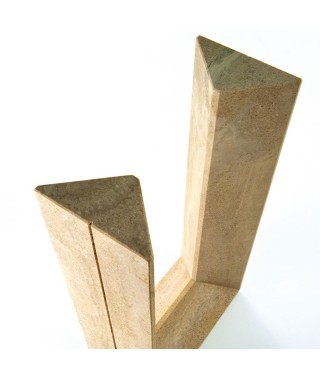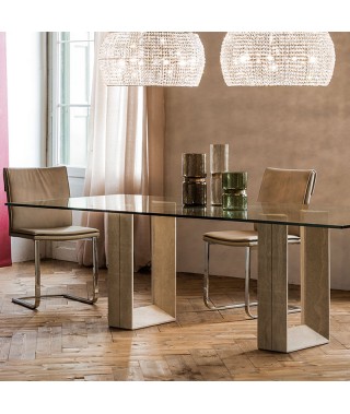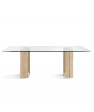 Tavolo con base in Travertino (TN) o bianco Carrara (BC) e piano in cristallo trasparente 15mm. Piano in appoggio.