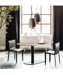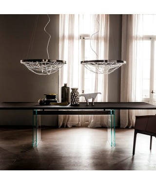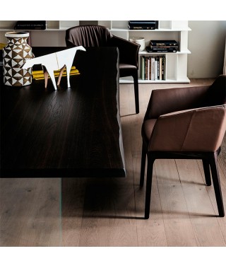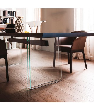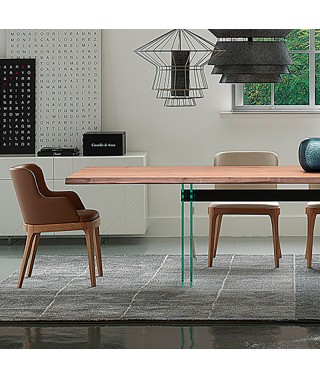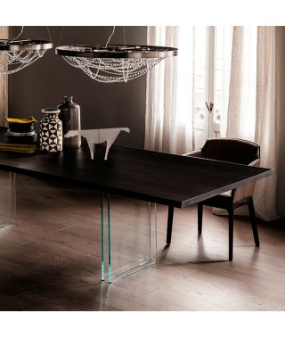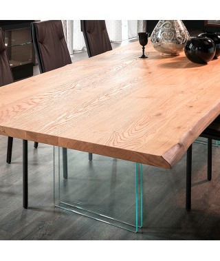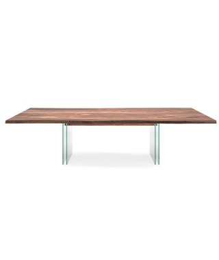 Tavolo con base in cristallo temperato extrachiaro trasparente 15mm e trave in graphite (OP69). Piano in noce Canaletto (NC), rovere bruciato (RB) o rovere naturale (RN) con bordi irregolari in massello. Disponibile anche trave in noce Canaletto (NC), rovere bruciato (RB) o rovere naturale (RN).