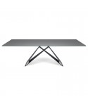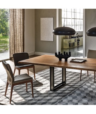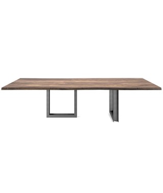 Tavolo con base in metallo verniciato trasparente (OP0). Piano in noce Canaletto (NC), rovere bruciato (RB) o rovere naturale (RN) con bordi irregolari in massello.