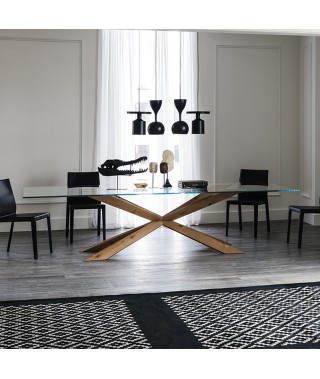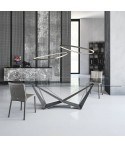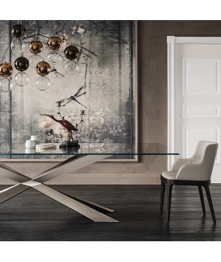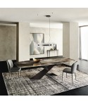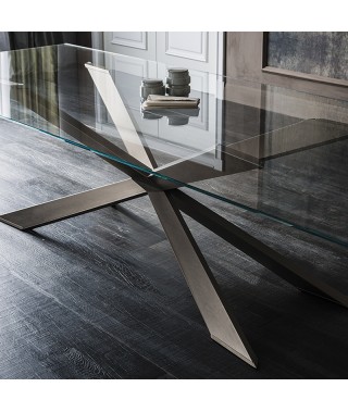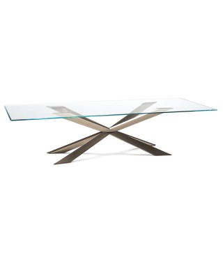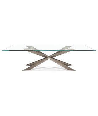 Tavolo con base in acciaio verniciato opaco nero (OP17), graphite (OP69), bianco (OP71), inox lucido, bronzo satinato (15), titanio satinato (11), noce Canaletto (NC), dark wenghè (W2) o Rovere Heritage (HR).