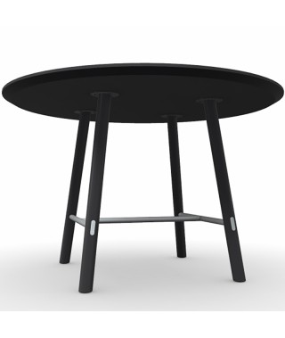Tavolo YO! fisso, tondo o rettangolare, con gambe in legno massello di faggio a sezione tonda e piani in legno impiallacciato in tinta con bordo inclinato.