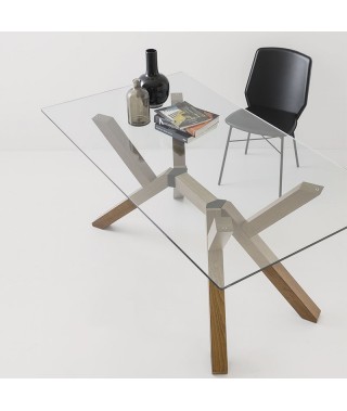 MIKADO è un tavolo rettangolare fisso con piano in vetro temprato e struttura e gambe in legno di faggio.