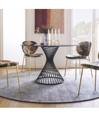 In VORTEX è ancora più forte grazie alla sua funzionale e decorativa base centrale che, con la struttura in tubo di metallo a forma elicoidale, personalizza il tavolo.
