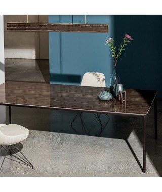 Tavolo con gambe in alluminio pressofuso cromato o verniciato, varie finiture, e struttura con profilo in alluminio anodizzato o verniciato, varie finiture.
