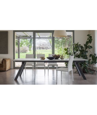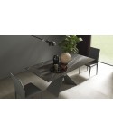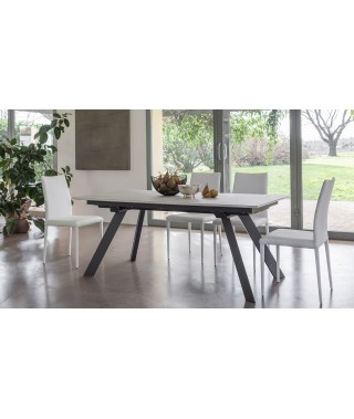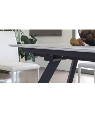 Tavolo in struttura allungabile in metallo, meccanismo telescopico. Piano in ceramica, prolunga interna a libro in MDF in tinta.