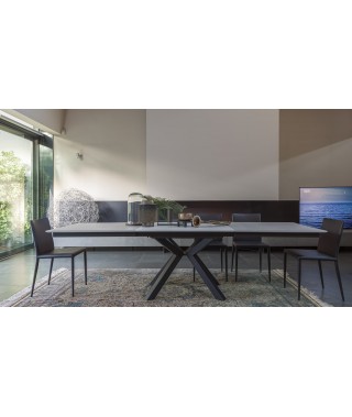 IL SOTTILE SPESSORE DELLA CERAMICA IN SUPERFICIE DONA LEGGEREZZA AL PIANO, CHE SI APRE AL CENTRO PER ALLUNGARSI. CON LE SUE FORME SIMMETRICHE, IL TAVOLO DA PRANZO GIADA, CONQUISTA LA SCENA ED ARREDA CREANDO UN EQUILIBRIO ESTETICO SENZA EGUALI.