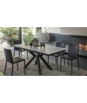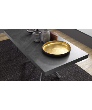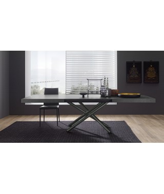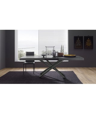 Fahrenheit si esprime attraverso la sua singolare struttura ad intreccio in metallo, inconfondibile nel design, espandibile nella sua versione allungata. Il piano ad alto spessore è anch’esso un elemento caratterizzante come in questa versione in nobilitato ardesia, e si staglia in centro stanza come un’opera scultorea contemporanea.