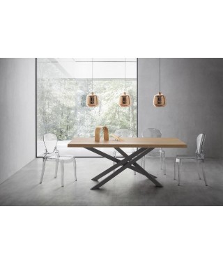 Disponibile con guida in metallo verniciato a polveri con allunghe a libro laterali. Piani da 30mm rivestiti in laminato HPL, Fenix ntm, impiallacciato rovere naturale.